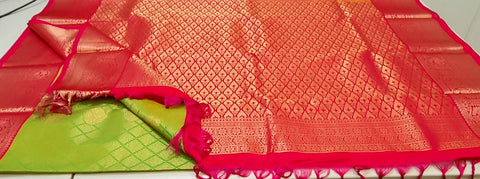 Color - Trendy and gorgeous Green shade having a Bhuttis weave in the body and a Pink border with exquisite motifs.