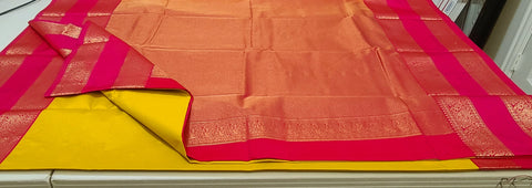 Color - Trendy and gorgeous Turmeric Yellow shade having a Vaira Oosi weave in the body and a Pink border with exquisite motifs.