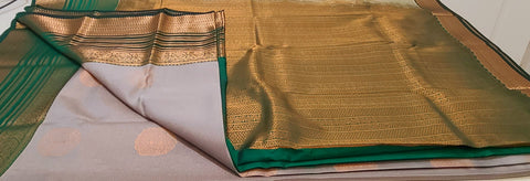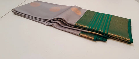Color - Trendy and gorgeous Silver Grey shade having a Vaira Oosi weave in the body and a Green border with exquisite motifs.