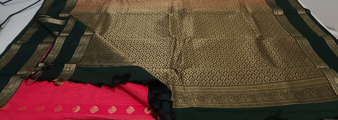 Color - Trendy and gorgeous Tomato Pink shade having a jari weaves in the body and a Green border with exquisite motifs.